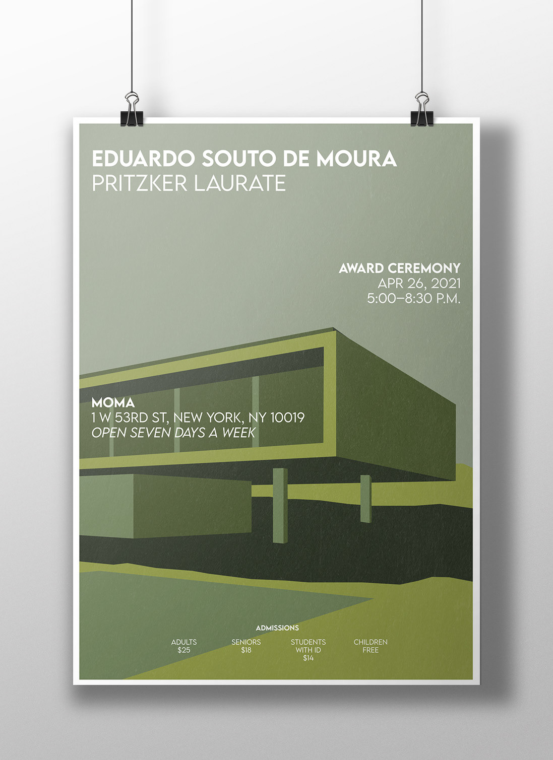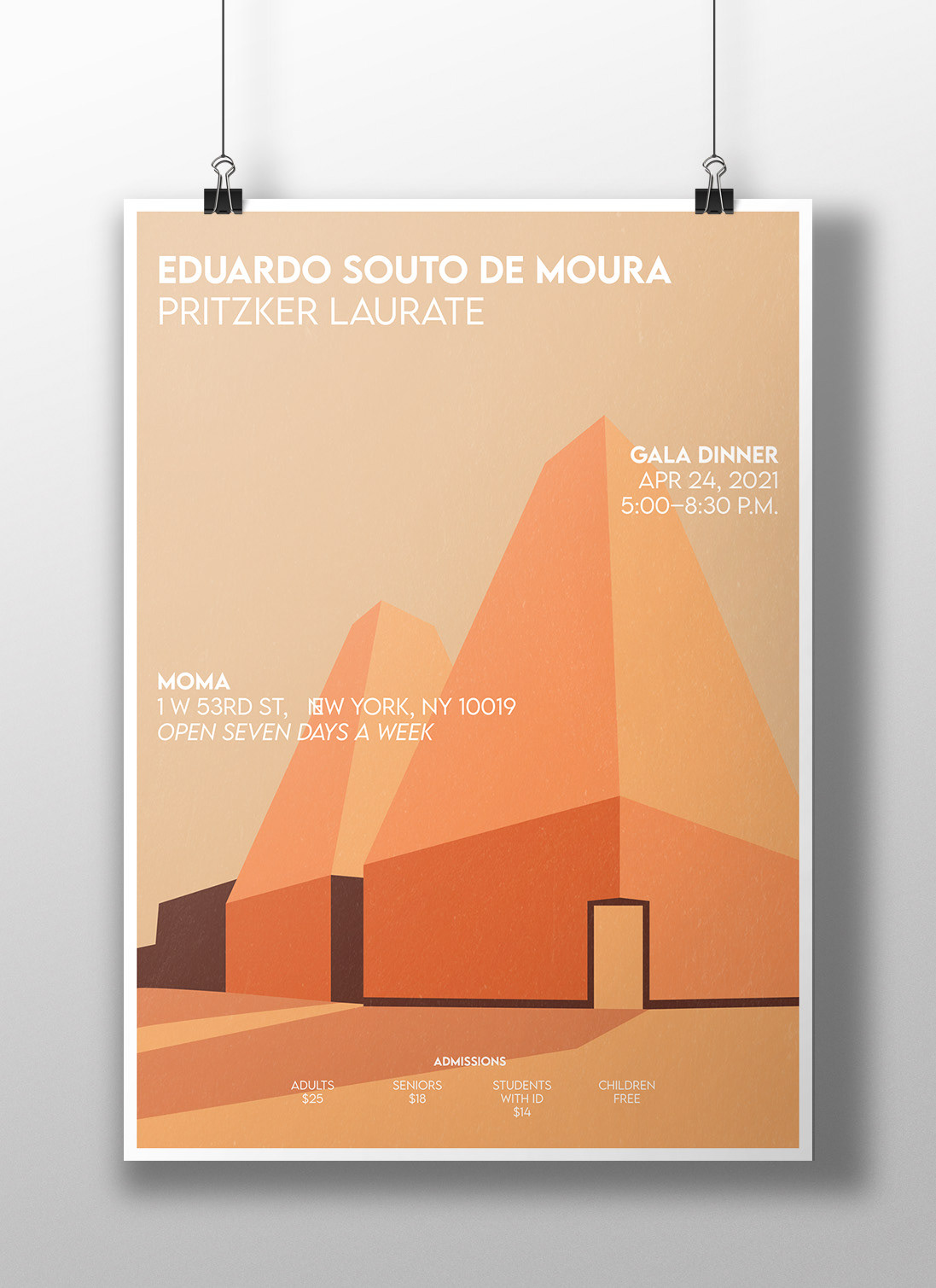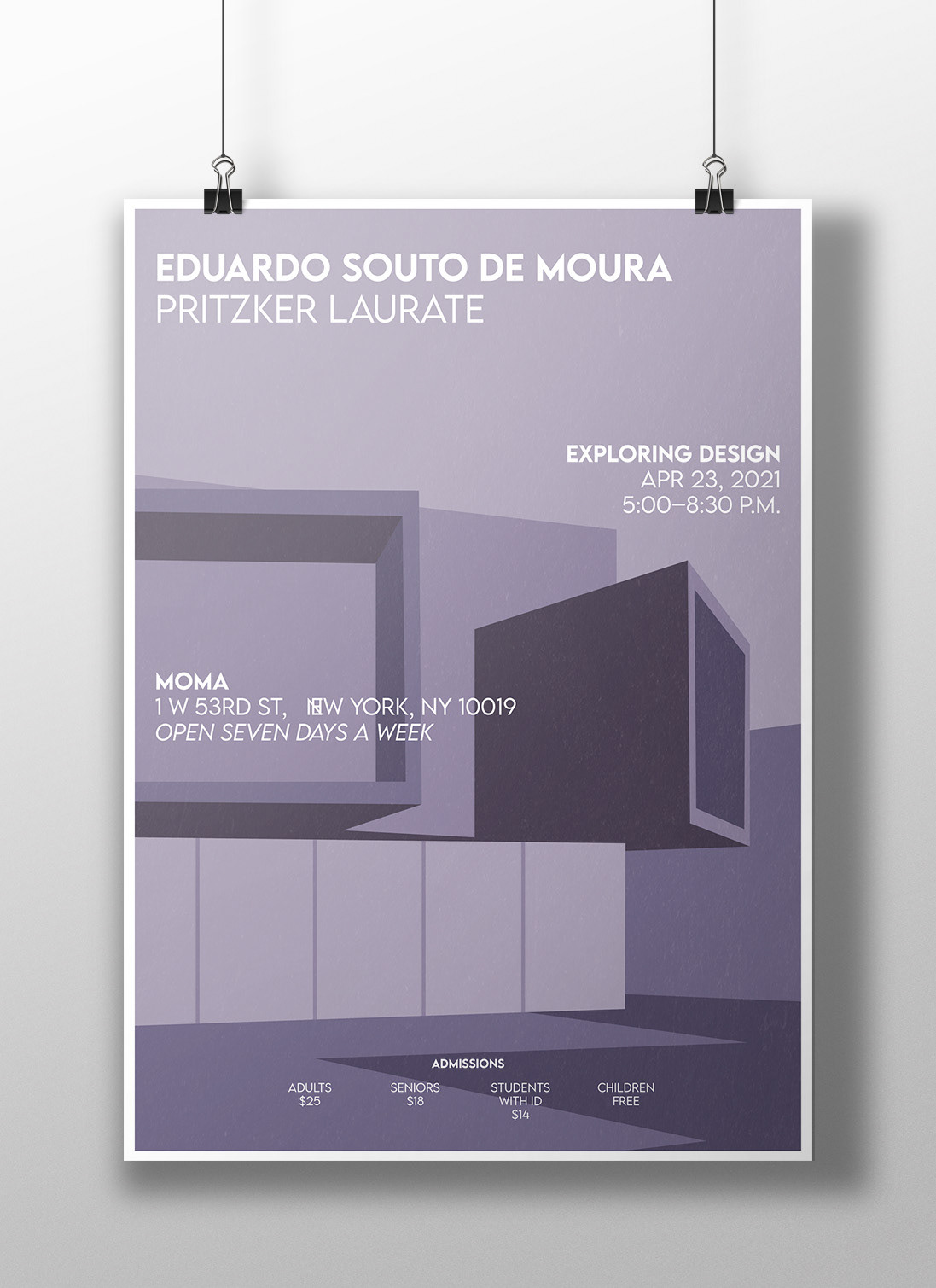 For this project, we had to create a series of three posters featuring the work of a chosen architect. The poster also needed to include information for different events at the MoMA. For these posters, I chose architect Eduardo Souto De Moura and created three posters inspired by a few of his most popular buildings.