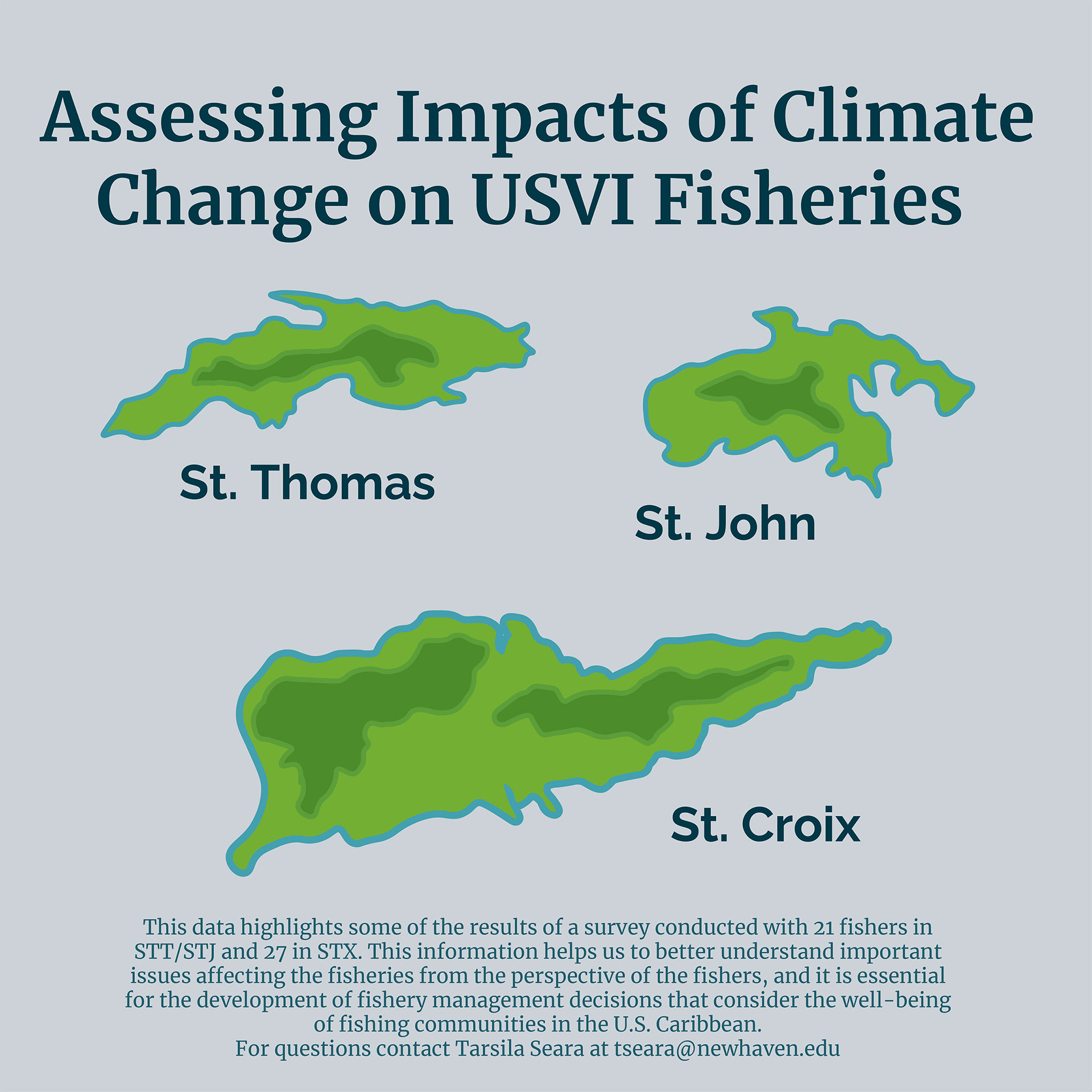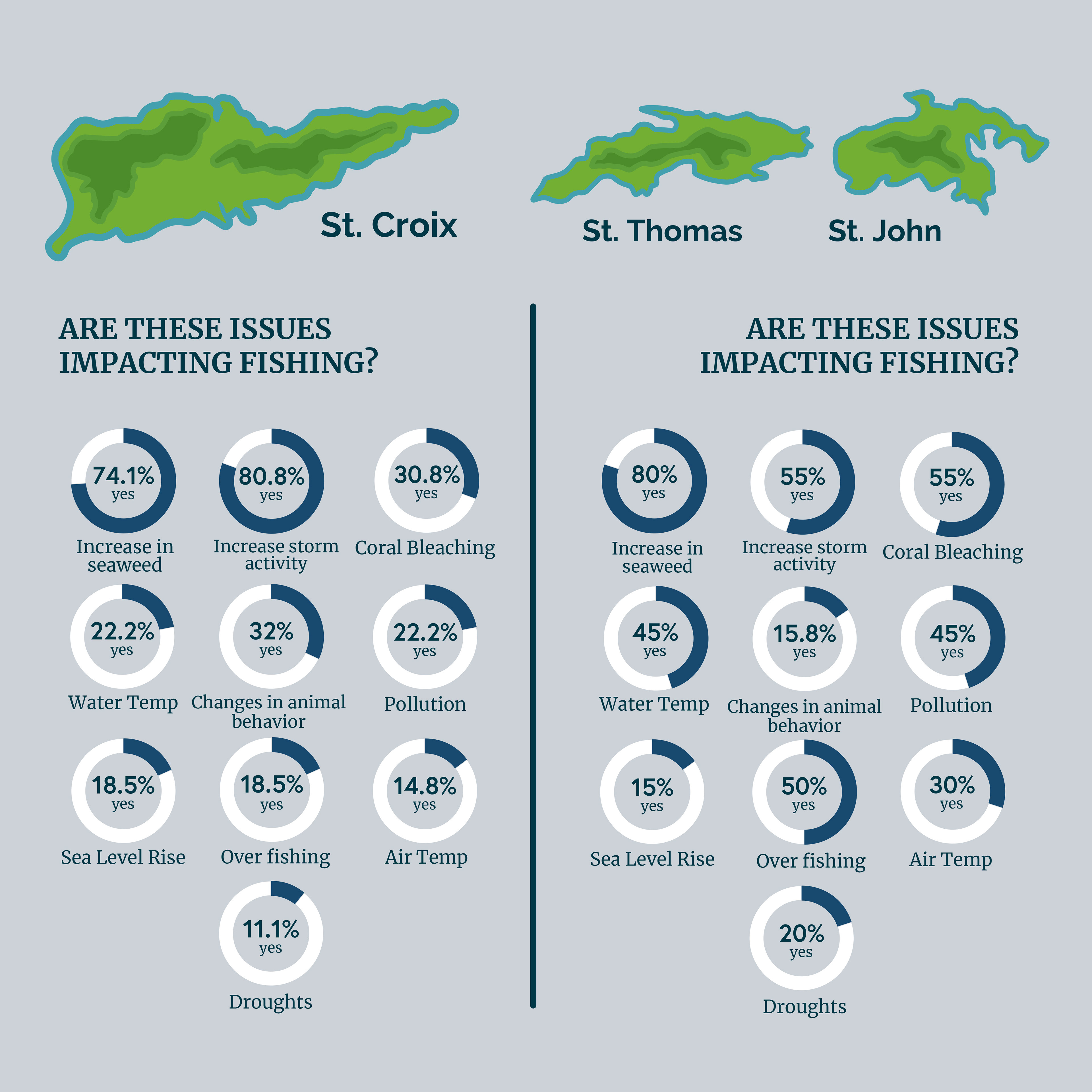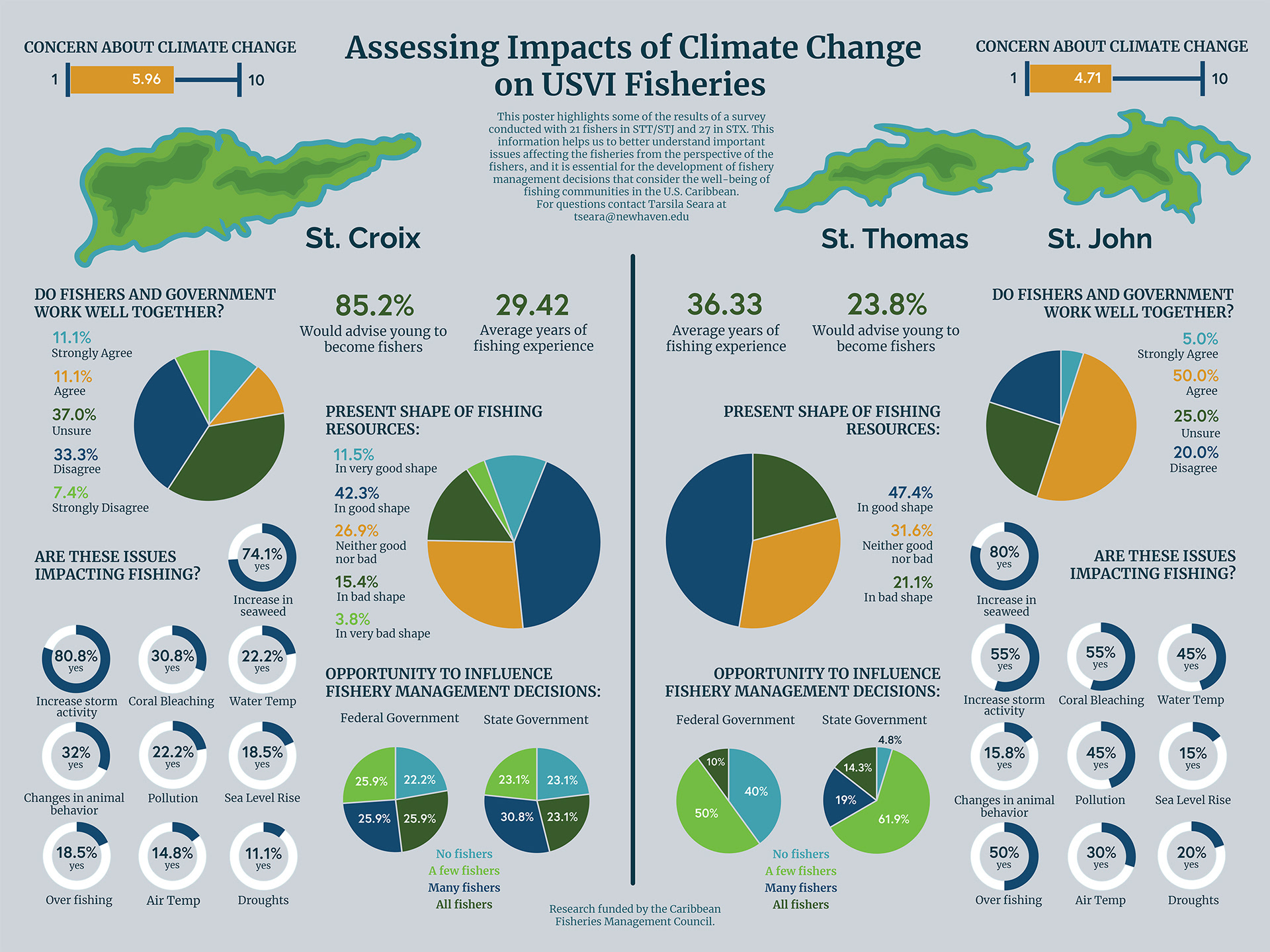 Infographic poster presenting survey data that assesses the impacts of climate change on U.S Virgin Island fisheries.