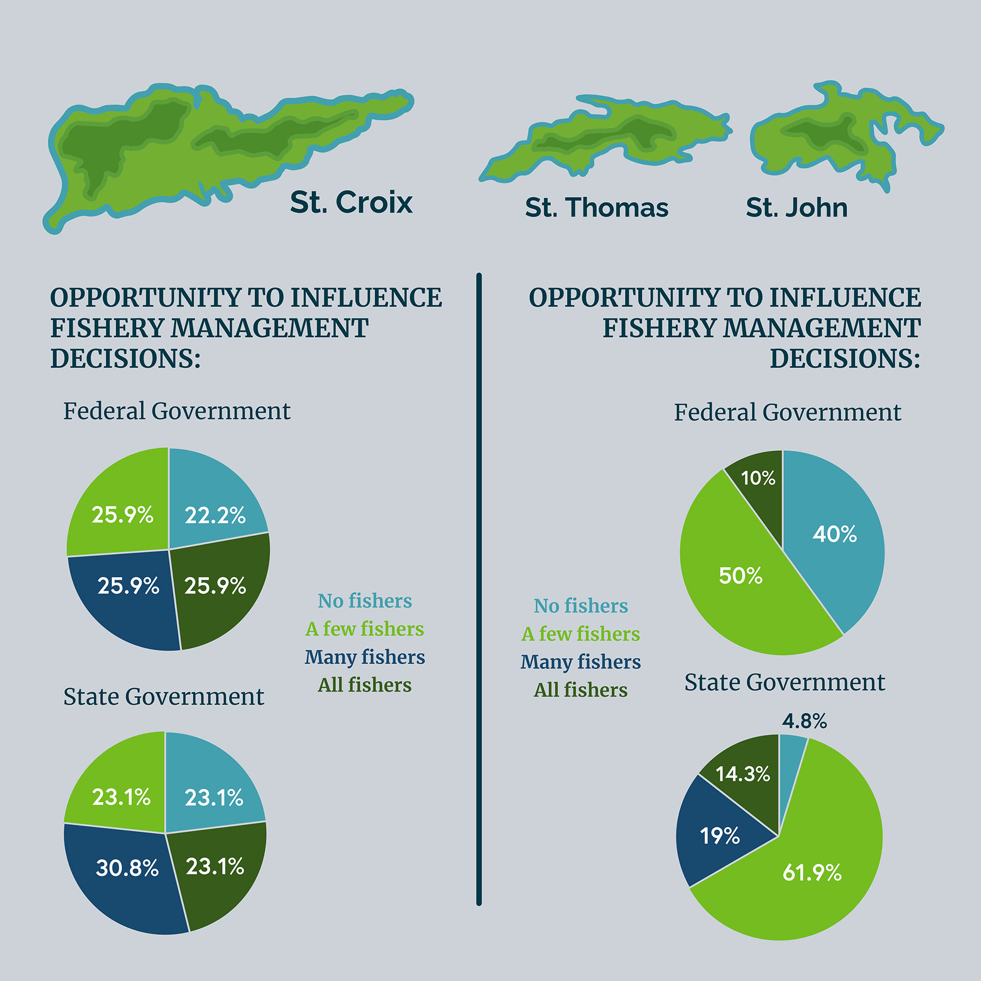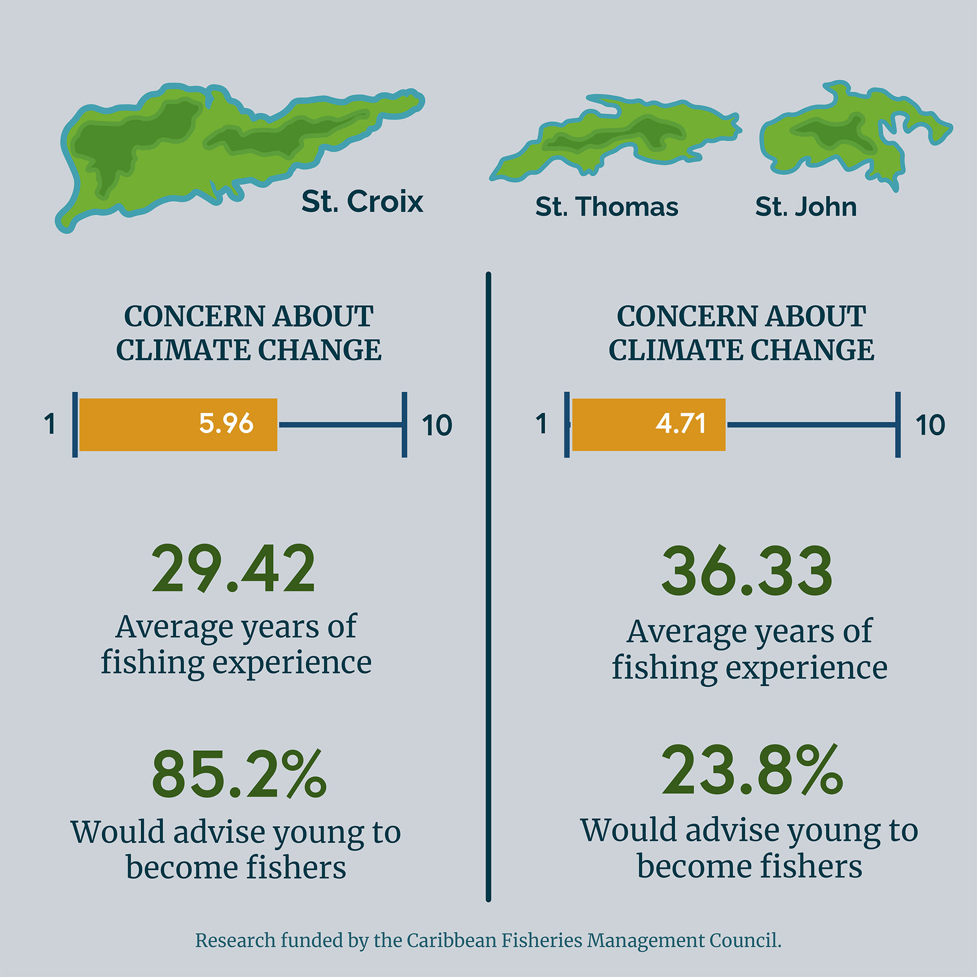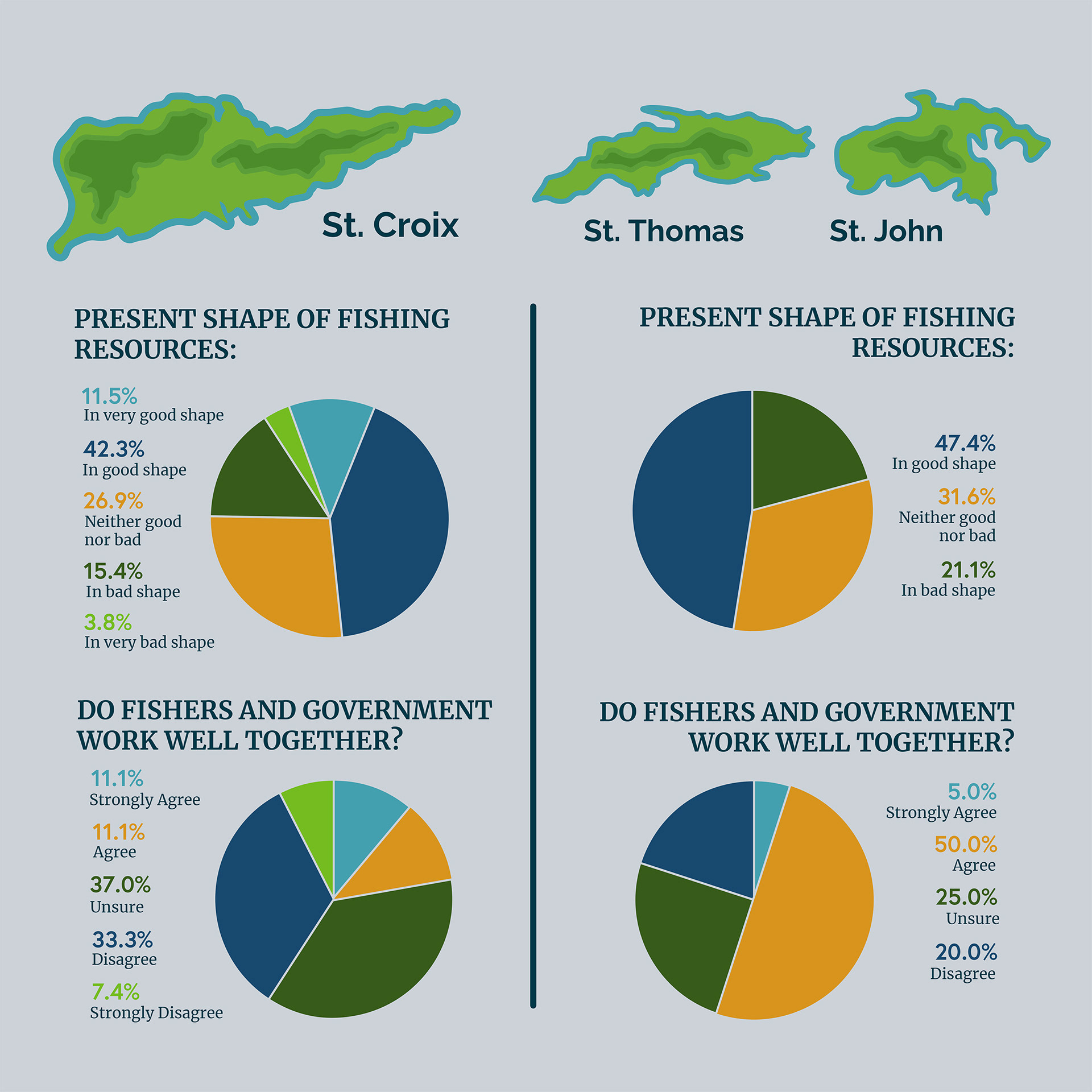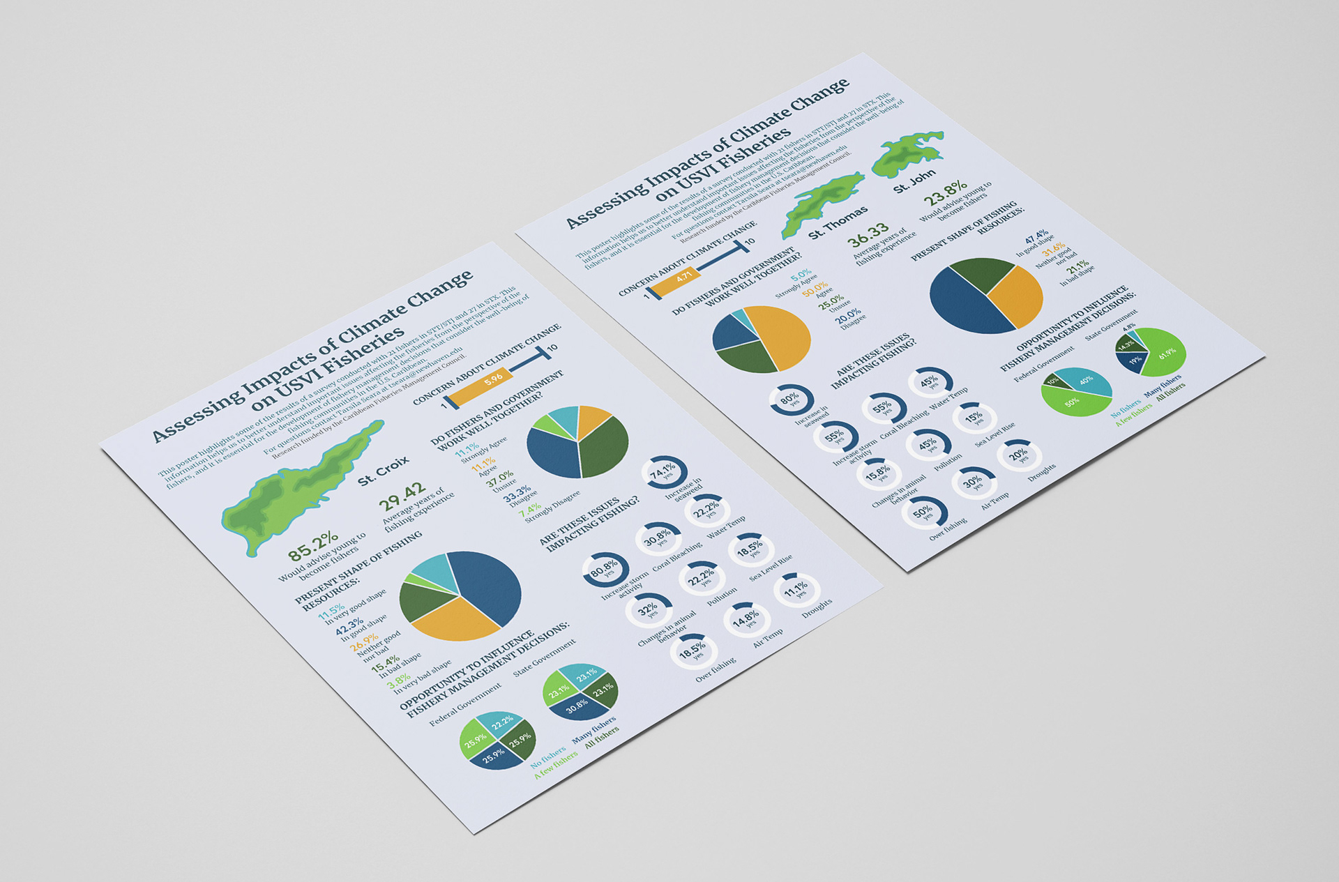 Infographic poster presenting survey data that assesses the impacts of climate change on U.S Virgin Island fisheries.